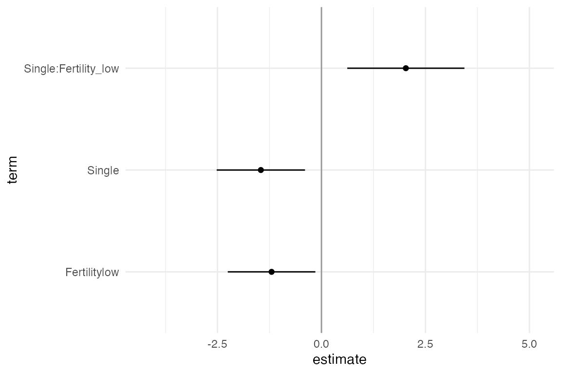 filter( term == "Fertilitylow:RelationshipStatusSingle" | term == "Fertilitylow:Relationship") %>%